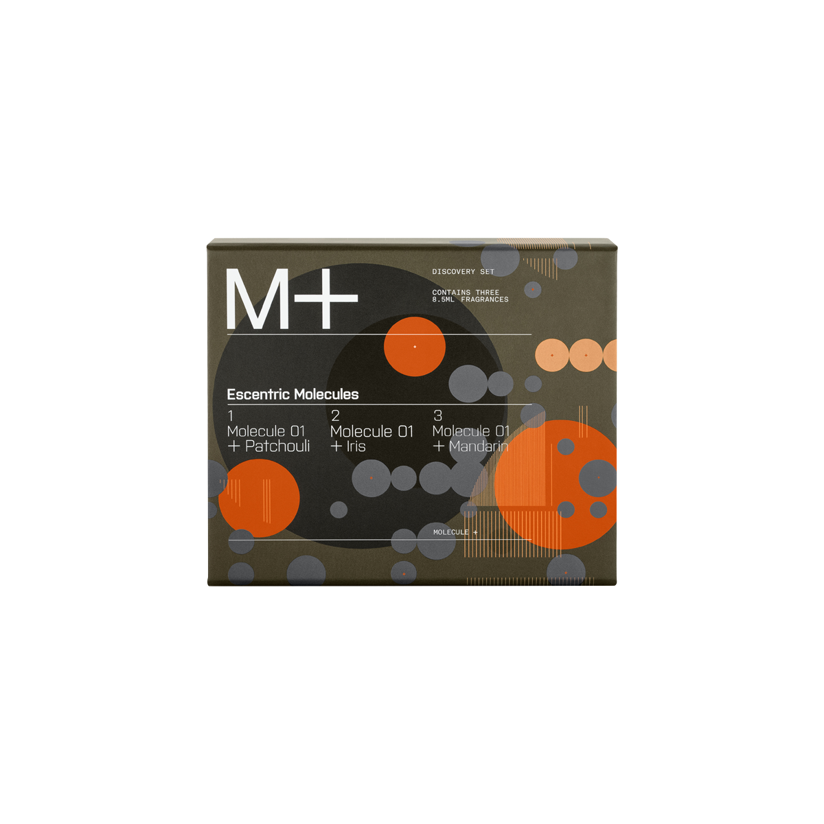 De Escentric M+ Discovery Set is perfect geschikt om kennis te maken met het parfum Molecule 01 van Escentric Molecules. Dit is een uitzonderlijke molecule: stralend, fluweelzacht en omarmend. De M+ Discovery Set bevat drie flacons van 8,5ml van het parfum Molecule 01 met de extra ingrediënten Patchoeli, Iris en Mandarin.
